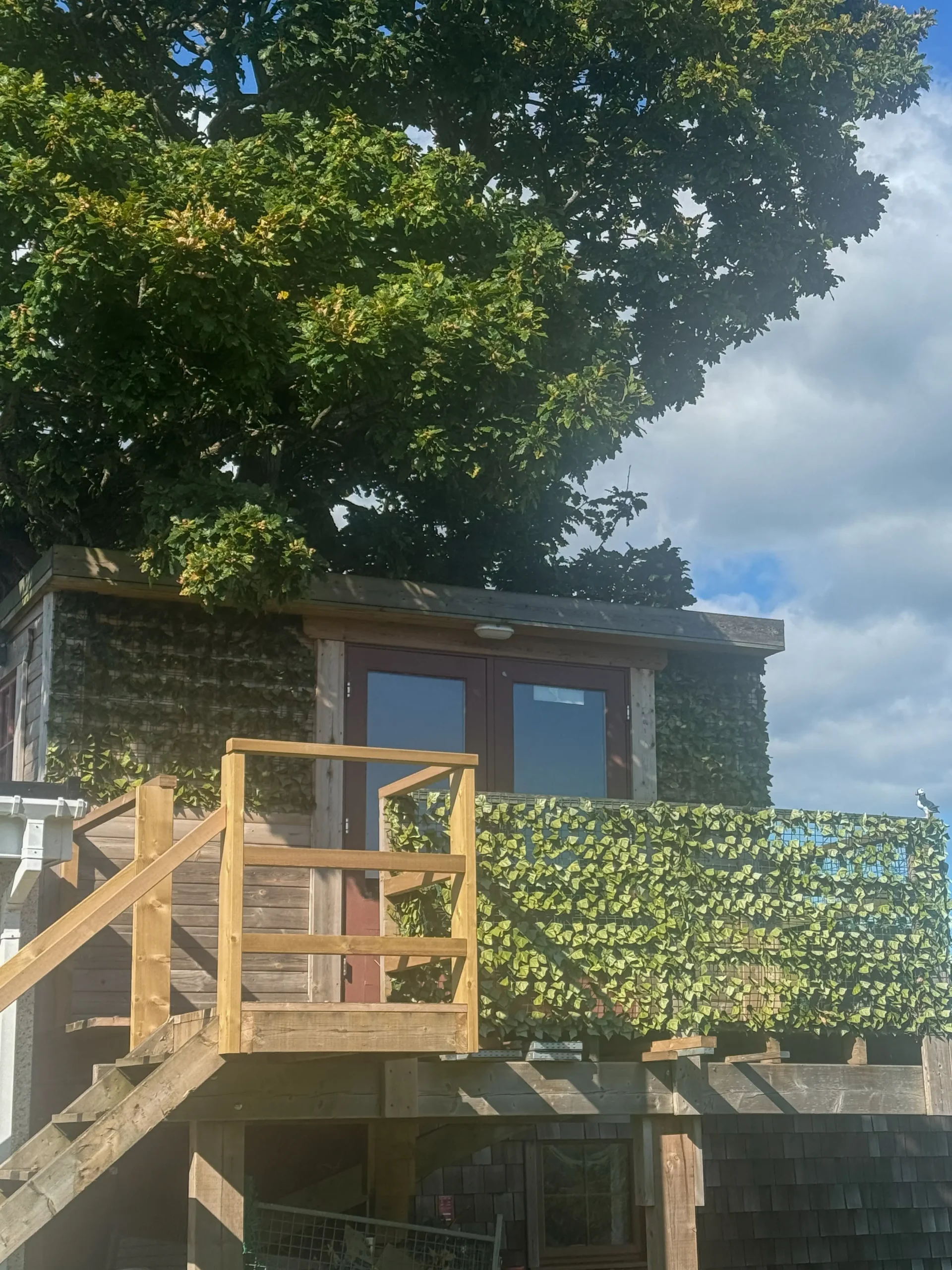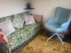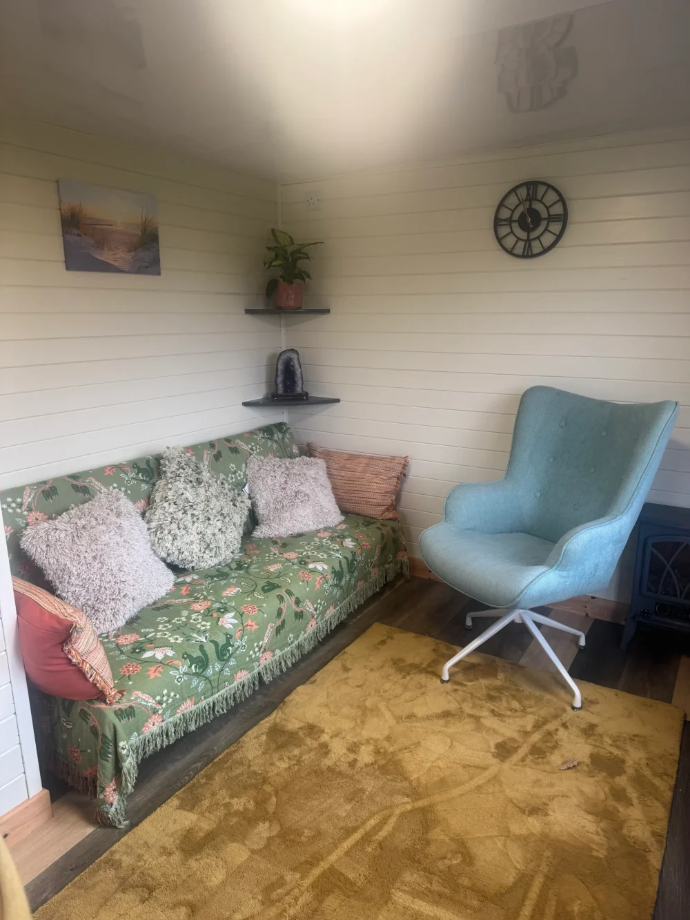 I believe that the environment my clients have their face to face sessions with me is very important, the space should feel comfortable, safe and cosy. My unusual setting is up a few steps into a tree house with stunning views. I hope this gives the client a feeling of a welcome break from their everyday life where they can solely concentrate on their own wellbeing without any distractions.
